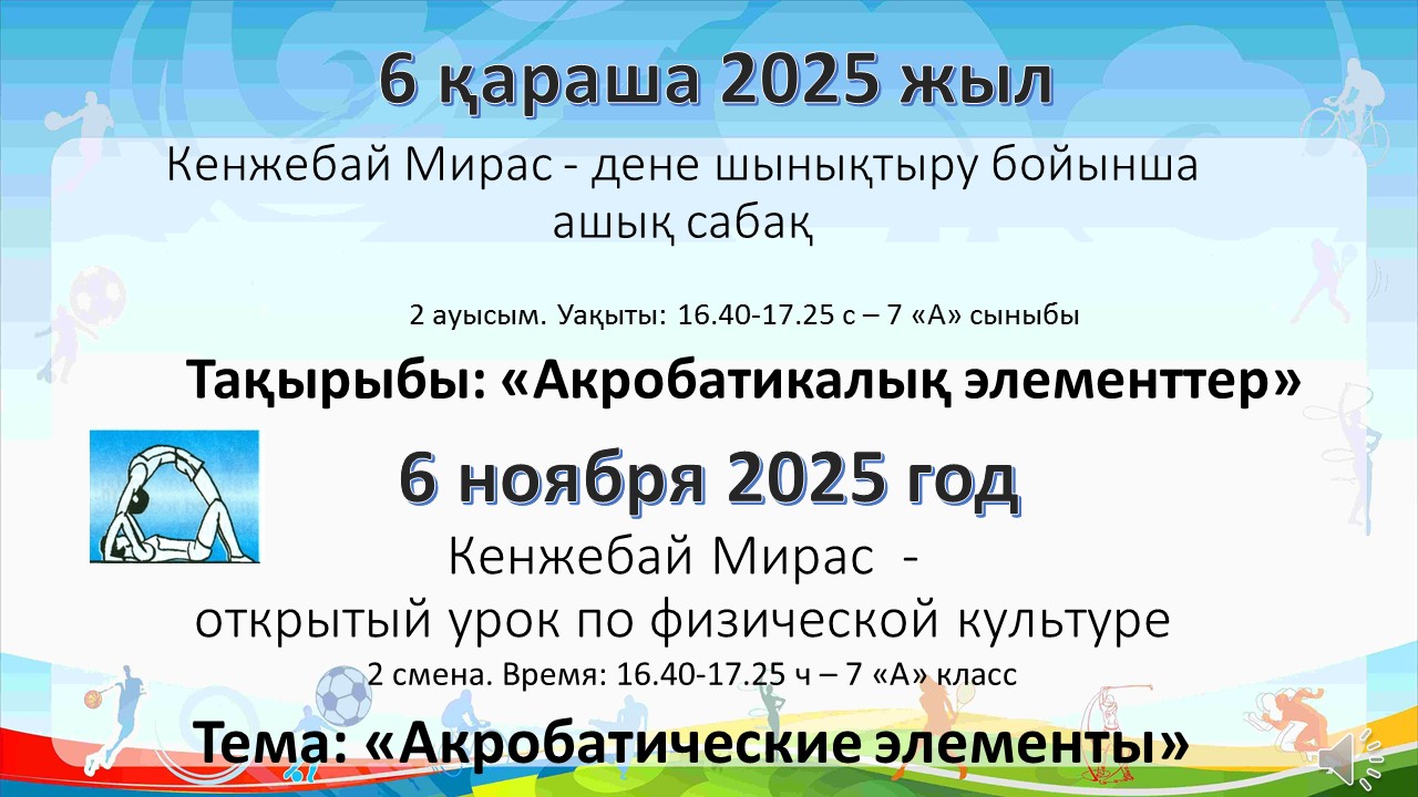 06 қараша 2025 0 1 2 3 4 5 06.11.2025 "Акробатикалық элементтер" Кенжебай Мирас - дене шынықтыру бойынша ашық сабақ 06.11.2025. Кенжебай Мирас - открытый урок по физической культуре Тема: «Акробатические элементы»