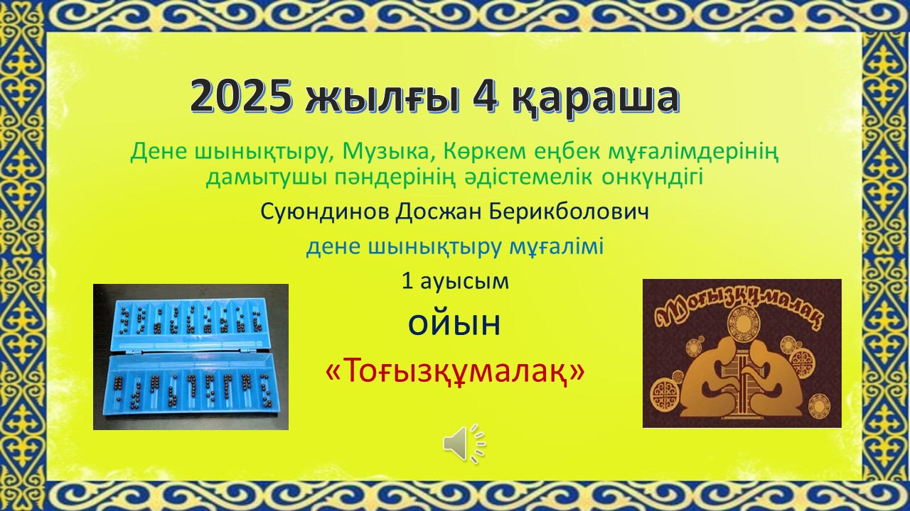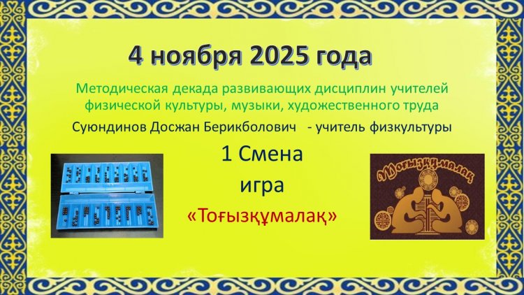 04 ноябрь 2025 0 1 2 3 4 5 04.11.2025 Ойын «Тоғызқұмалақ» Суюндинов Досжан Берикболович дене шынықтыру мұғалімі 04.11.2025. игра «Тоғызқұмалақ» Суюндинов Досжан Берикболович - учитель физкультуры