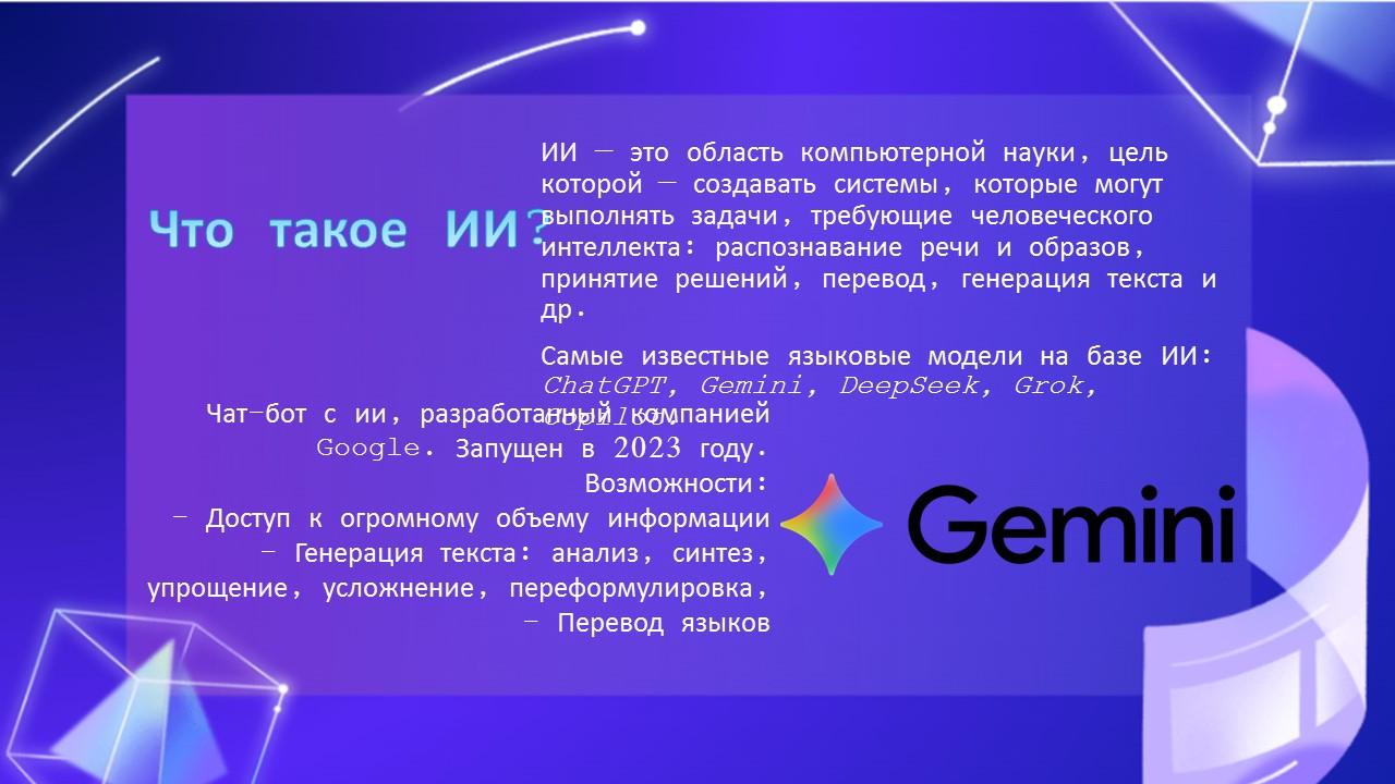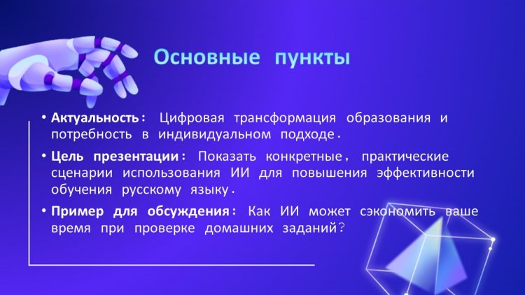 Цель моего доклада – рассмотреть ИИ не как угрозу или панацею, а как мощный инструмент с двумя сторонами: он открывает невероятные позитивные возможности, но также несет в себе потенциальные риски, которые мы обязаны учитывать. Мы обсудим, как ИИ может стать нашим помощником, и какие конкретные программы и приложения уже сегодня могут облегчить наш труд и повысить вовлеченность учеников.