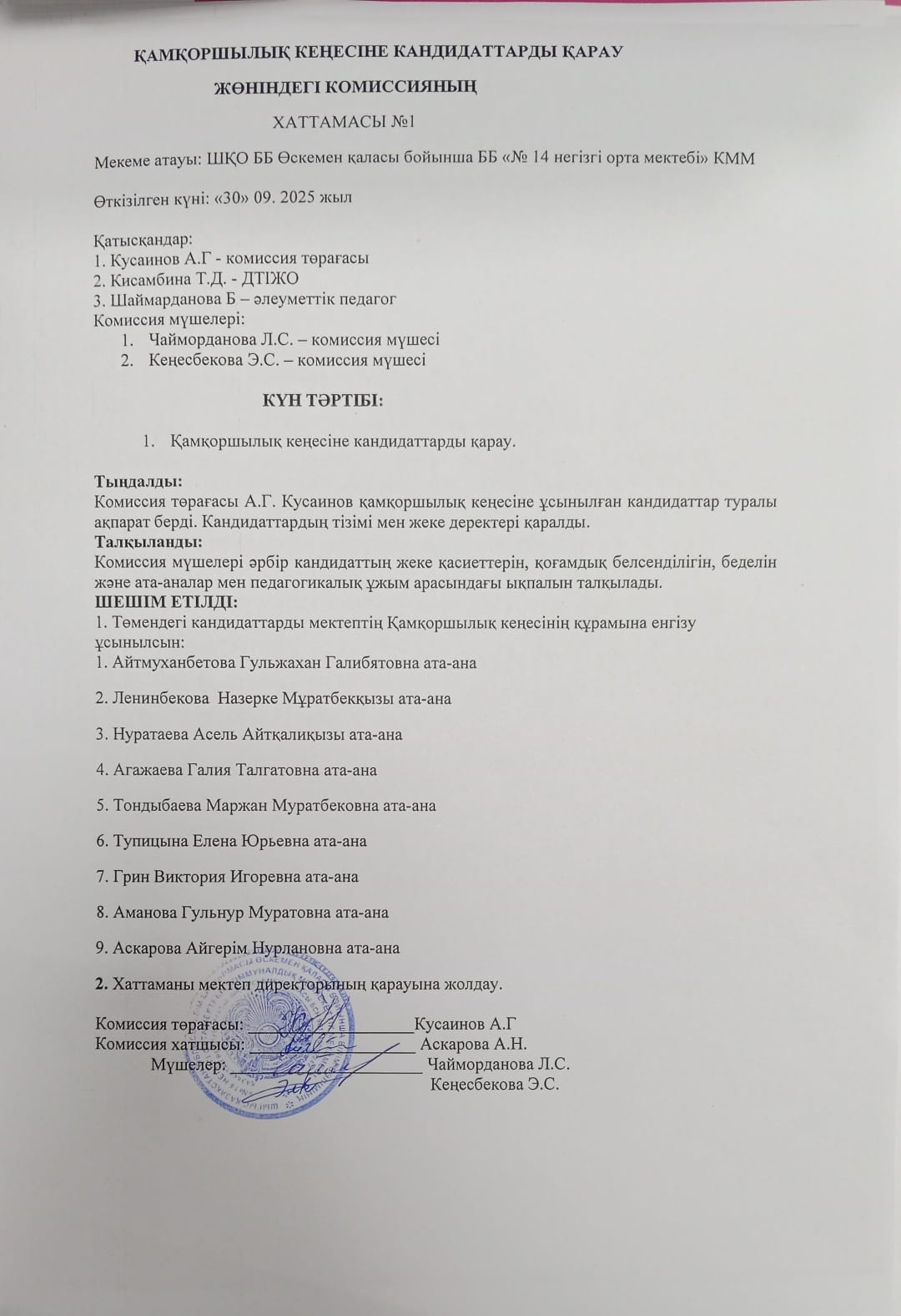 30 қыркүйек 2025 0 1 2 3 4 5 Қамқоршылық кеңесінде кандидаттарды қарау жөніндегі комиссияның хаттамасы. Протокол комиссии по рассмотрению кандидатов в попечительском совете.