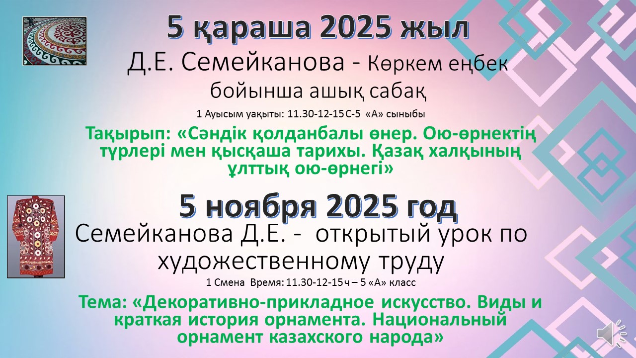 05.11.2025. Семейканова Д.Е. - открытый урок по художественному труду. Тема: «Декоративно-прикладное искусство. Виды и краткая история орнамента. Национальный орнамент казахского народа»